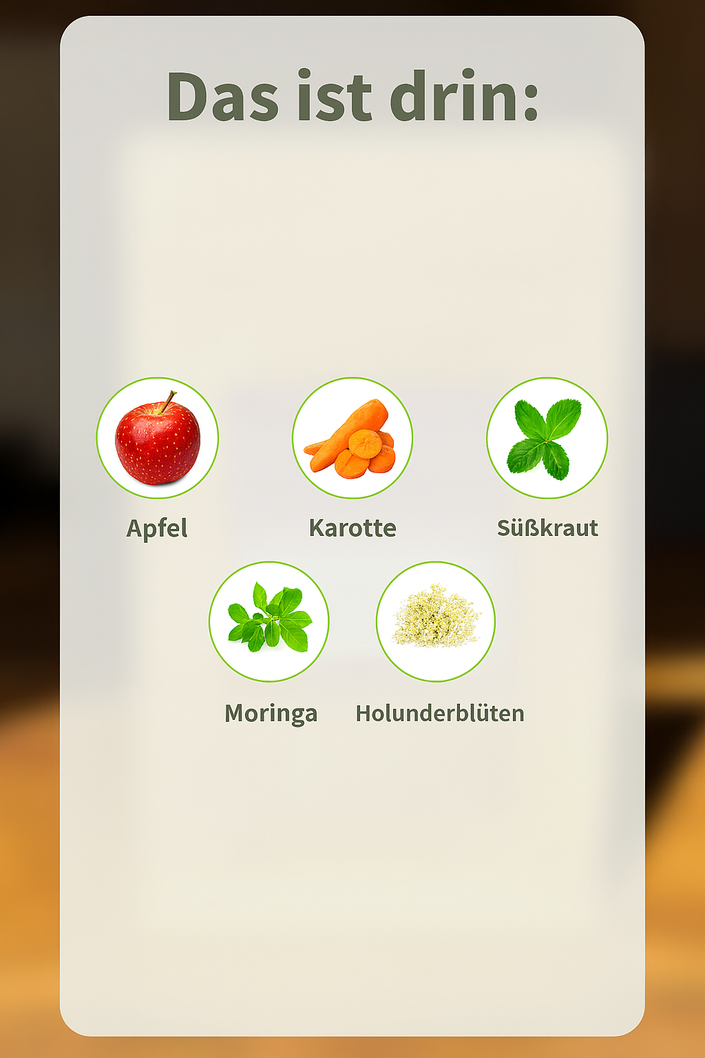 Apfelstücke (Säuerungsmittel: Zitronensäure), Karottenstücke, Aroma, Moringablätter, Süßkraut, Holunderblüten(1%)