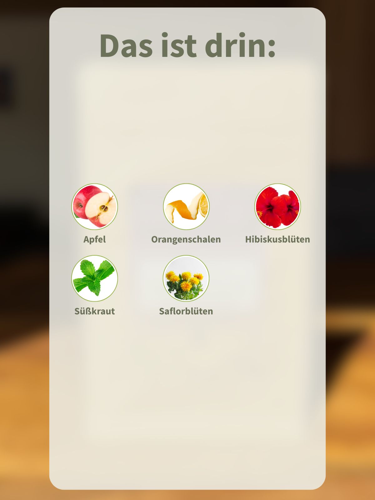 Apfelstücke (Apfel, Säuerungsmittel: Zitronensäure), Orangenschalen(10%), Hibiskusblüten, Süßkraut, natürliches Aroma, Saflorblüten