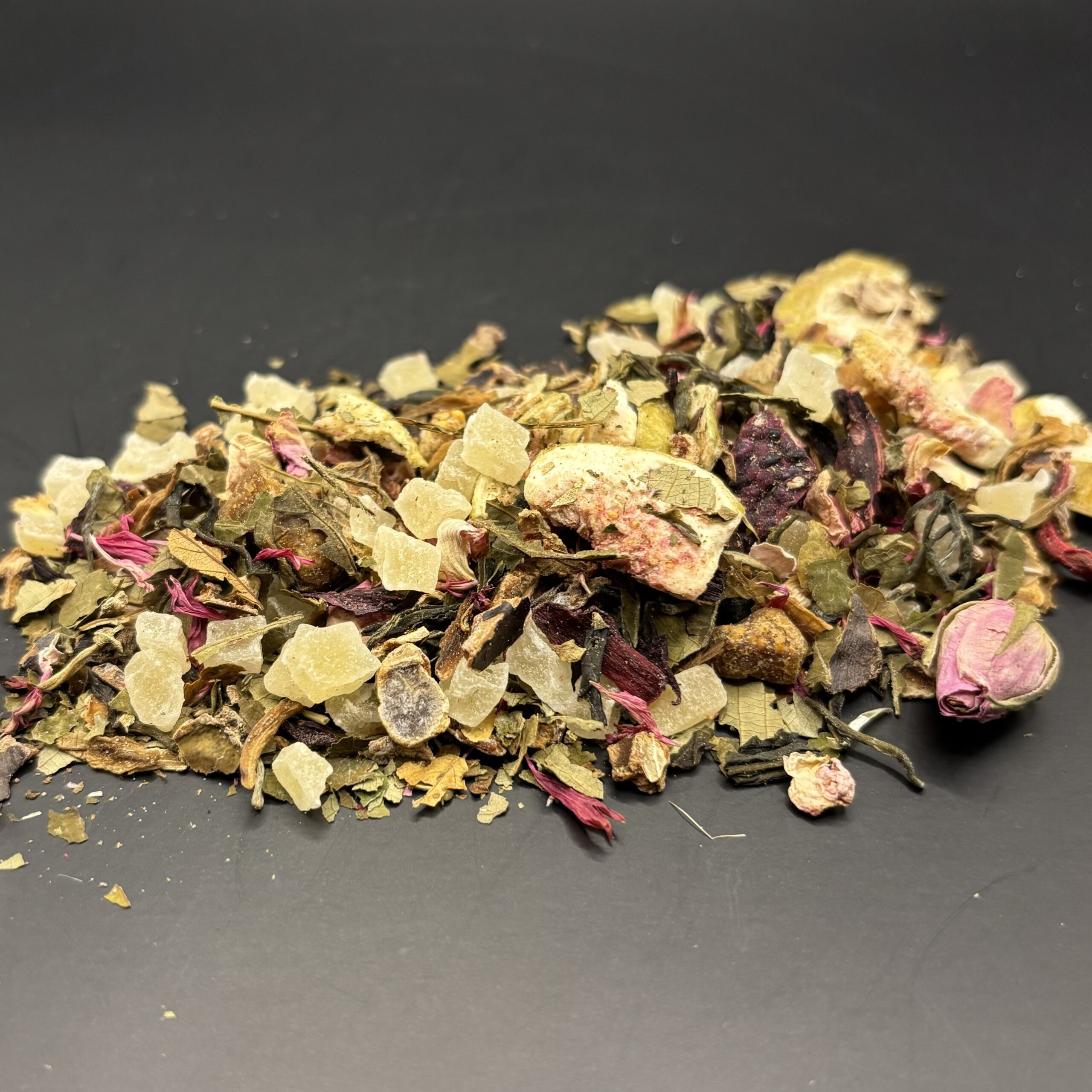 „Feige & Basilikum“ kombiniert fruchtige, florale und leicht würzige Aromen zu einer besonderen Teemischung. Ananas- und Feigenstücke verleihen dem Tee eine süße, tropische Fruchtigkeit, während der zarte weiße Tee eine elegante, blumige Basis bildet. Basilikum fügt eine subtile, würzige Frische hinzu, die perfekt mit den floralen Noten von Rosenknospen, Rosenblütenblättern und Kornblumenblüten harmoniert. Drachenfruchtstücke sorgen für eine exotische Nuance, die den Tee vollmundig und leicht fruchtig macht.
