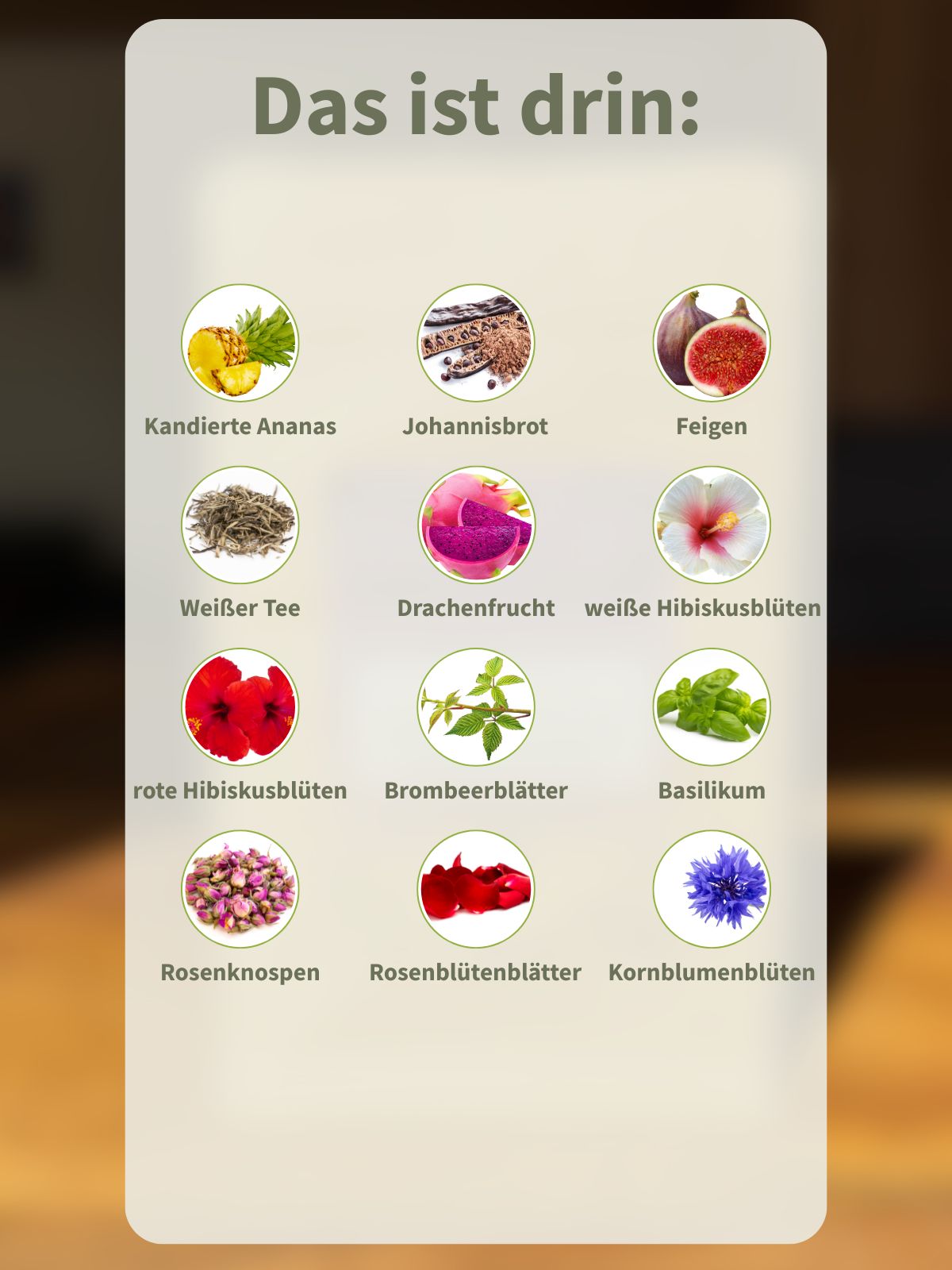 Ananasstücke (Ananas, Zucker, Säuerungsmittel: Zitronensäure), Johannisbrotstücke, Feigenstücke mit Trennmittel Reismehl (10 %), weißer Tee (10 %), süße Brombeerblätter, weiße Hibiskusblüten, rote Hibiskusblüten, natürliches Aroma, Feigenscheiben (3 %), Drachenfruchtstücke (Drachenfrucht, Säuerungsmittel: Zitronensäure), Basilikum (2 %), Rosenknospen, Rosenblütenblätter, Kornblumenblütenblätter