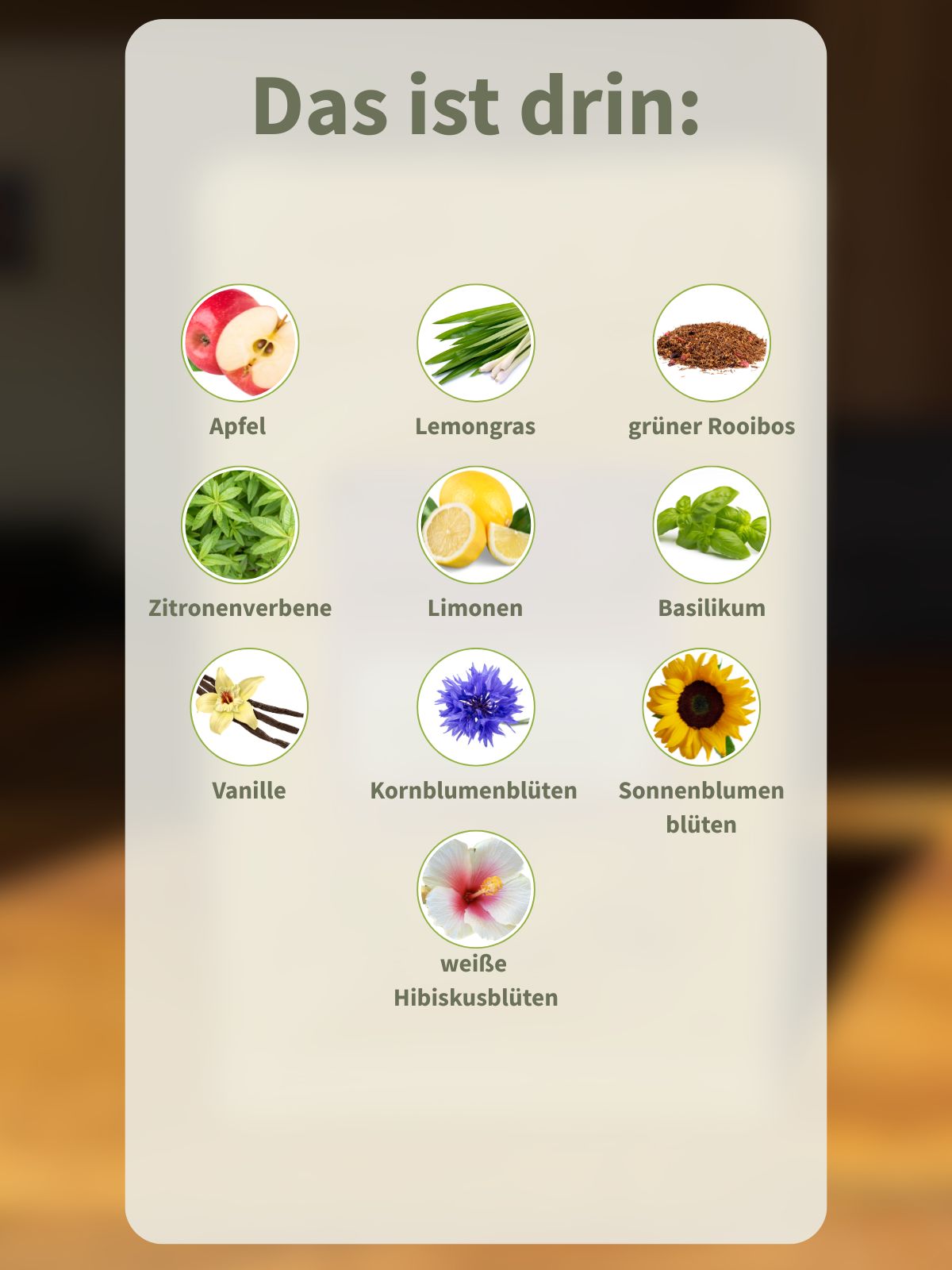 Apfelstücke (Apfel, Säuerungsmittel: Zitronensäure), Lemongras, grüner Rooibos, Zitronenverbenenkraut, Limonenstücke, Basilikum, natürliches Aroma, weiße Hibiskusblüten, Kornblumenblüten, Sonnenblumenblüten, Vanillestücke(0,5%)