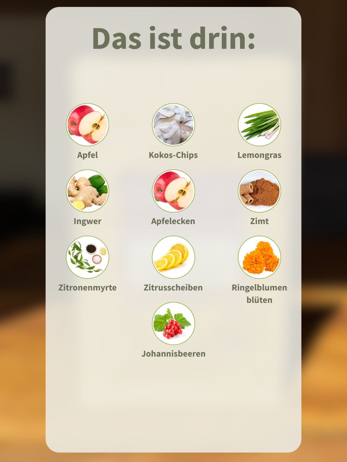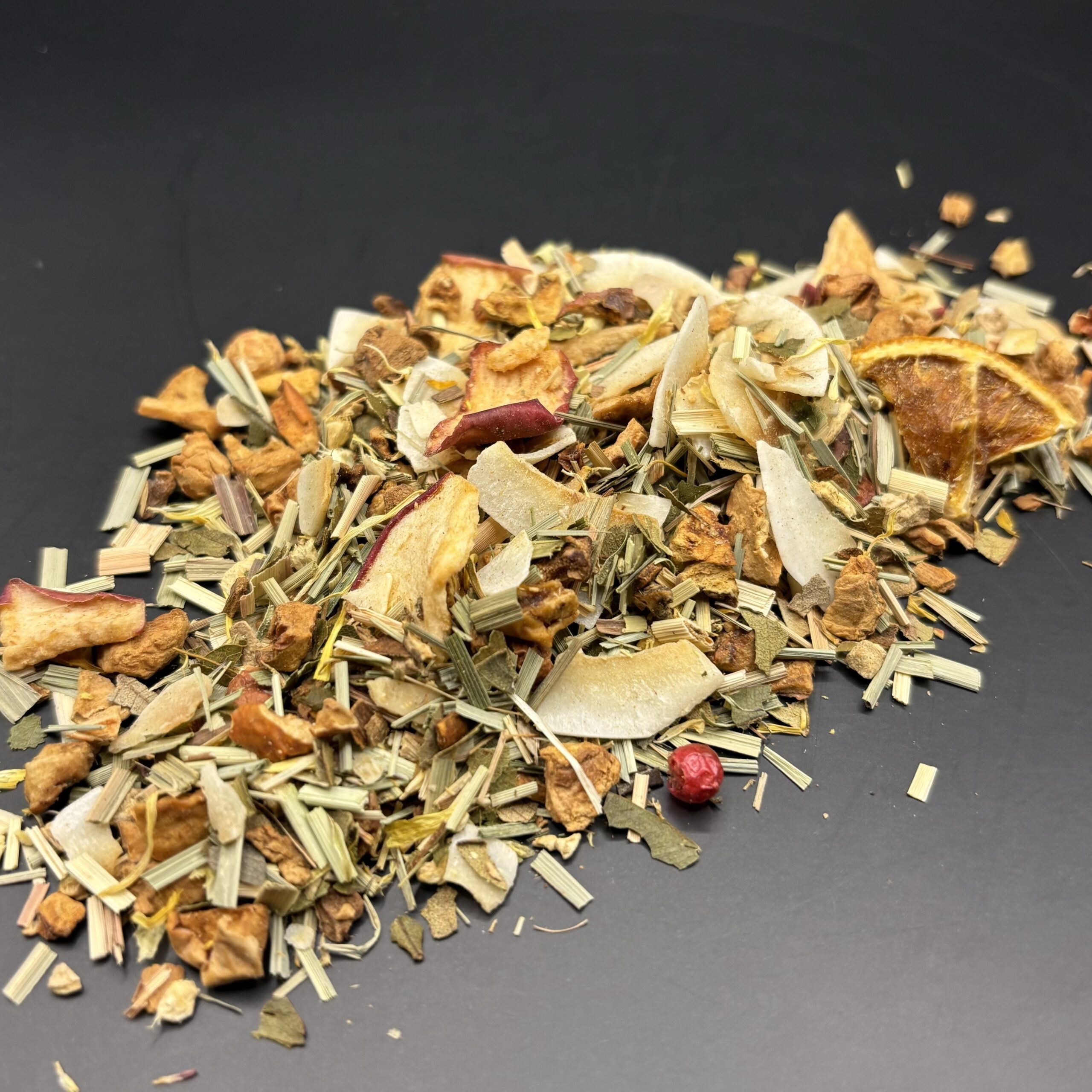 Apfelstücke, Kokos-Chips, Lemongras, Ingwer, Apfelecken, Zimt, Zitronenmyrte, Zitrusscheiben, Ringelblumenblütenblätter, Rote Johannisbeeren