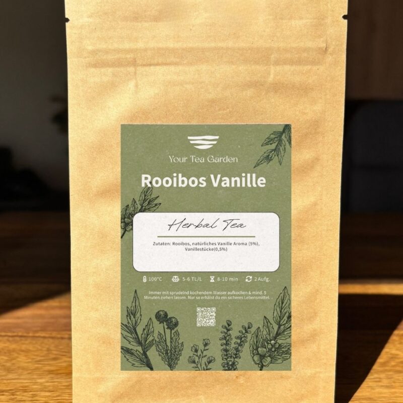 Rooibos Vanille vereint den milden, erdigen Geschmack von Rooibos mit der sanften Süße von Vanille. Koffeinfrei und voller natürlicher Aromen ist dieser Tee ideal für entspannte Momente zu jeder Tageszeit.