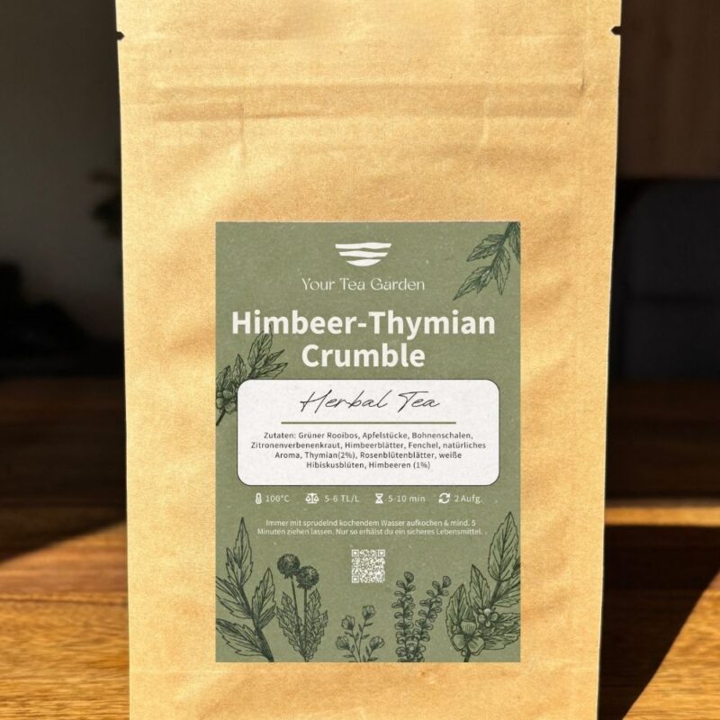 Vereint die fruchtige Süße von Himbeeren mit der würzigen Frische von Thymian auf einer grünen Rooibos-Basis. Ein fruchtig-würziger Genuss, der perfekt für jede Tageszeit ist.