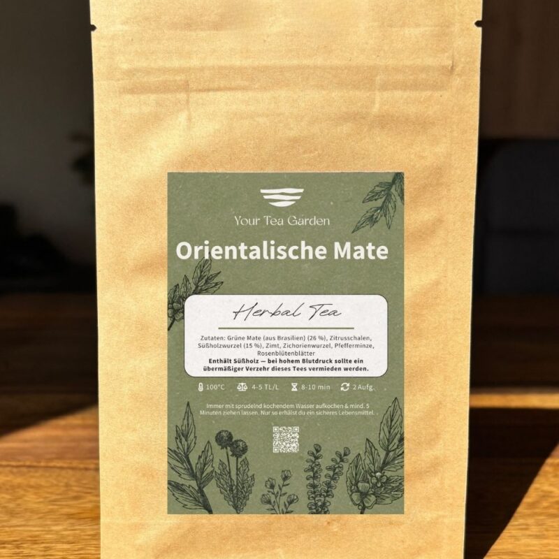 Südamerika trifft Orient. Orientalische Mate ist ein exotischer Hochgenuss aus grüner Mate, Zimt, Pfefferminze und Süßholz. Orientalische Aromen vereint zu einem frischen, süß-würzigen Tee, der dich mit jedem Schluck in die Welt von 1001 Nacht entführt.