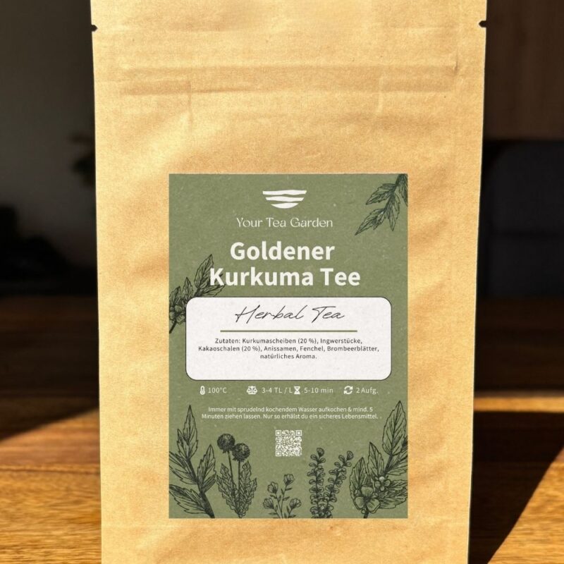 Ein wärmender Kurkuma Tee mit Ingwer, Kakaoschalen und Fenchel. Eine perfekte Mischung für entspannende und wohltuende Teemomente!