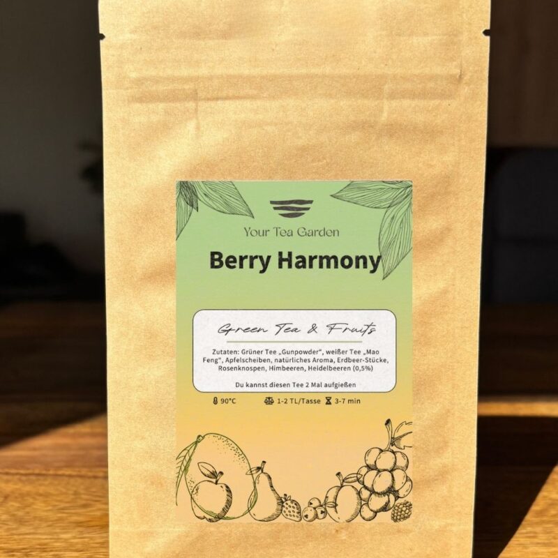 Berry Harmony kombiniert grünen und weißen Tee mit Rosenblüten und fruchtigen Erdbeeren, Heidelbeeren und Himbeeren – ein harmonischer und belebender Genuss.