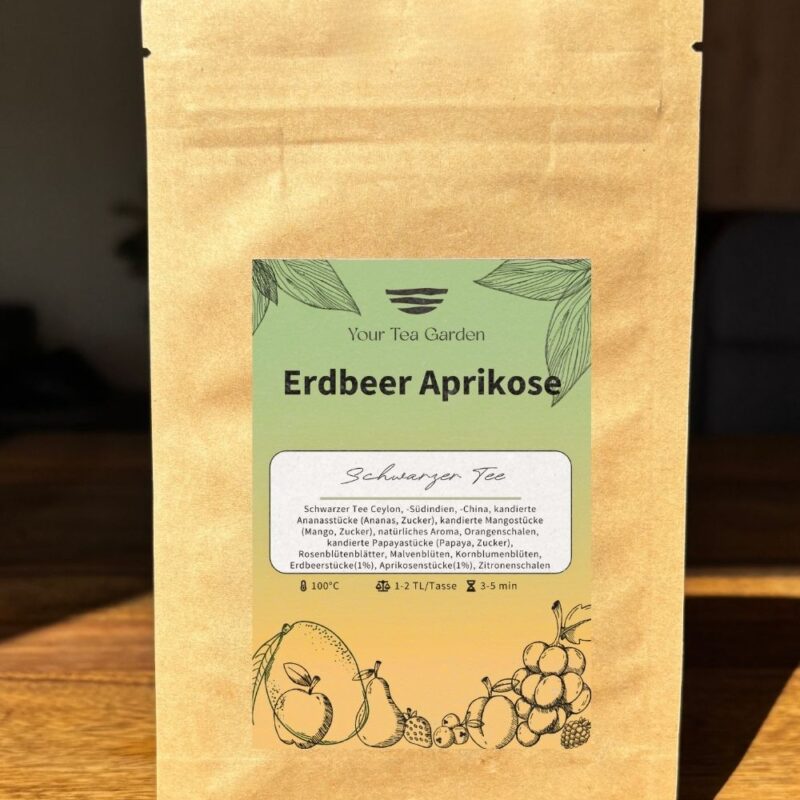 Schwarztee Erdbeer-Aprikose kombiniert kräftigen Schwarztee mit Erdbeeren, Ananas, Aprikosen, Mango und Blüten – fruchtig, blumig und perfekt für heißen oder kalten Genuss.