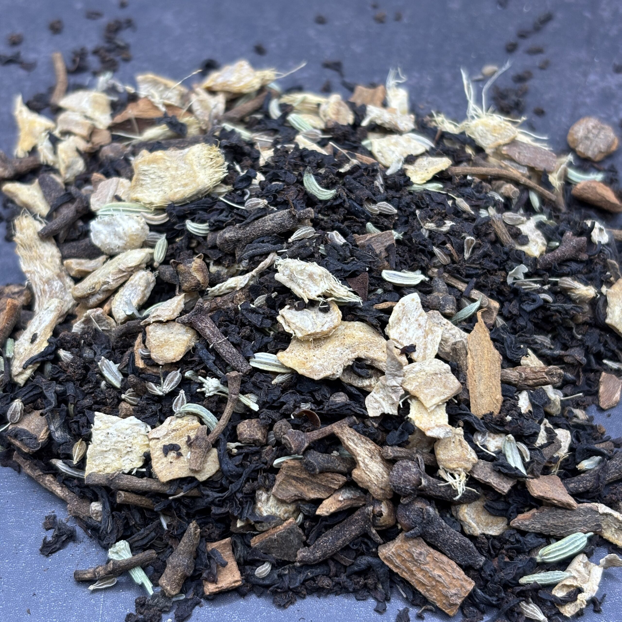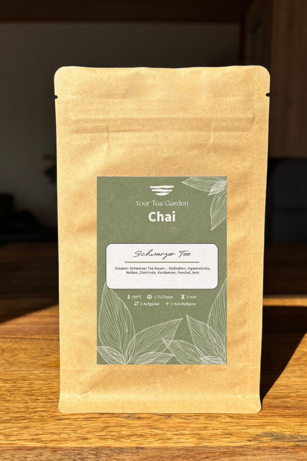 Chai ist eine würzige und aromatische Teemischung, die auf kräftigem Schwarzem Tee basiert und mit einer harmonischen Auswahl an warmen Gewürzen verfeinert wurde. Zimt und Nelken sorgen für eine süßlich-wärmende Note, während Ingwer, Kardamom und Anis eine leichte Schärfe und Tiefe verleihen. Fenchel rundet die Komposition mit einer milden, leicht süßlichen Nuance ab. Das Ergebnis ist ein vollmundiger, intensiv würziger Chai, der sowohl pur als auch mit Milch oder als traditionelle Chai-Latte genossen werden kann.