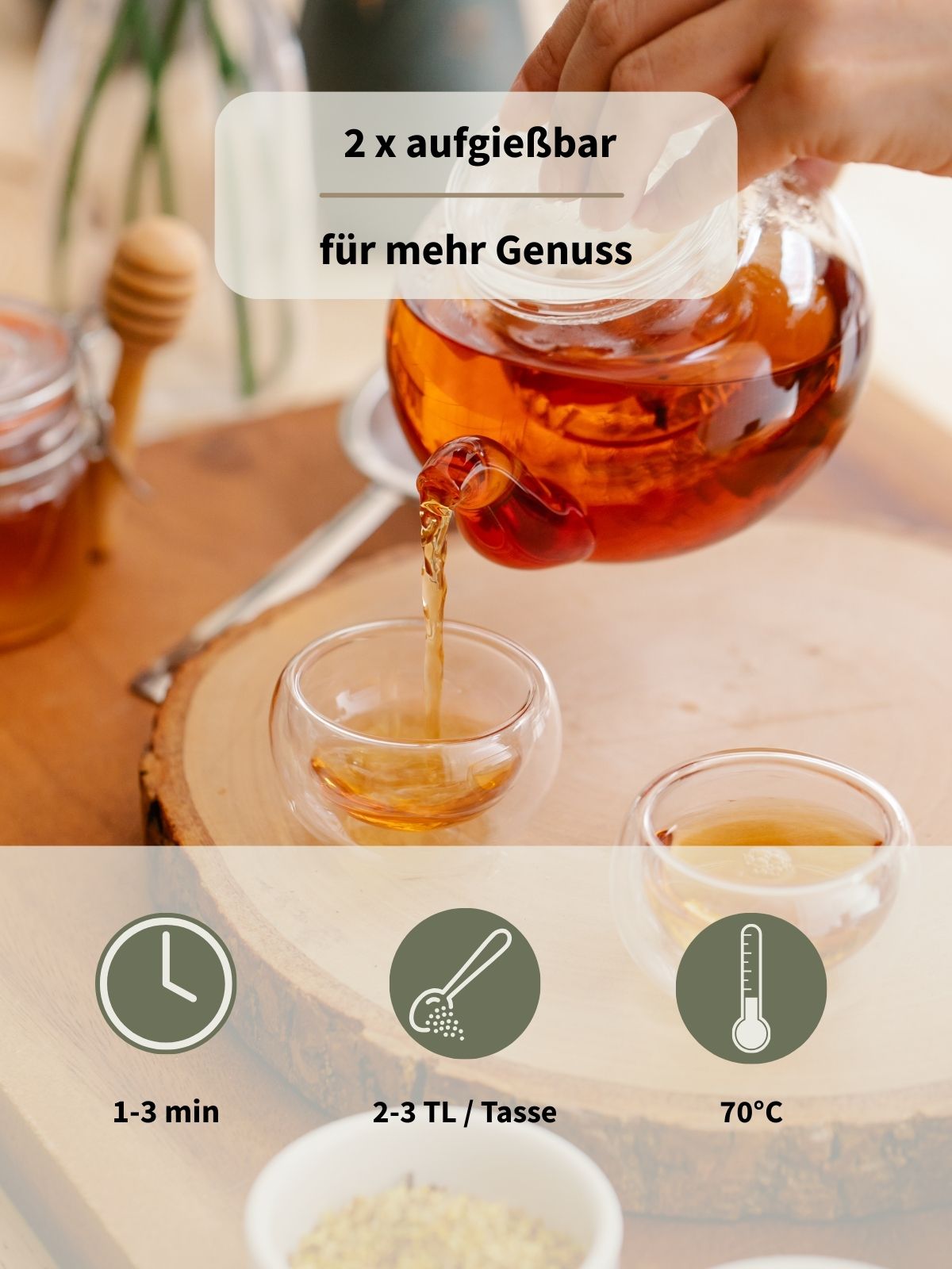 Bitterer oder saurer Tee kommt vor allem von zwei Faktoren: zu langer Ziehzeit oder zu heißem Wasser. Auf allen Verpackungen findest du die empfohlene Zubereitungsart. Solltest du deinen Tee doch mal zu lange in der Kanne vergessen, kannst du entweder mit weiterem Wasser verdünnen oder Süßungsmittel wie Honig oder Stevia dazu geben.