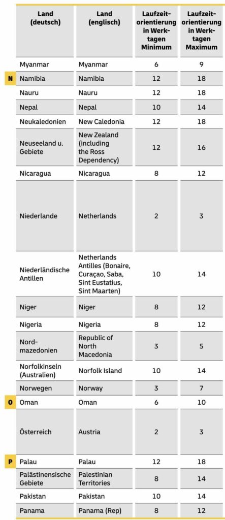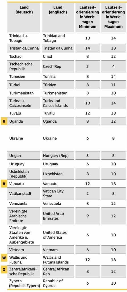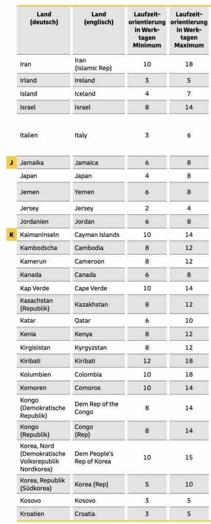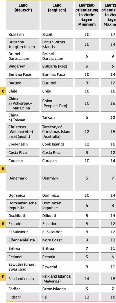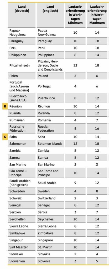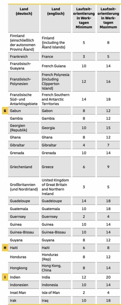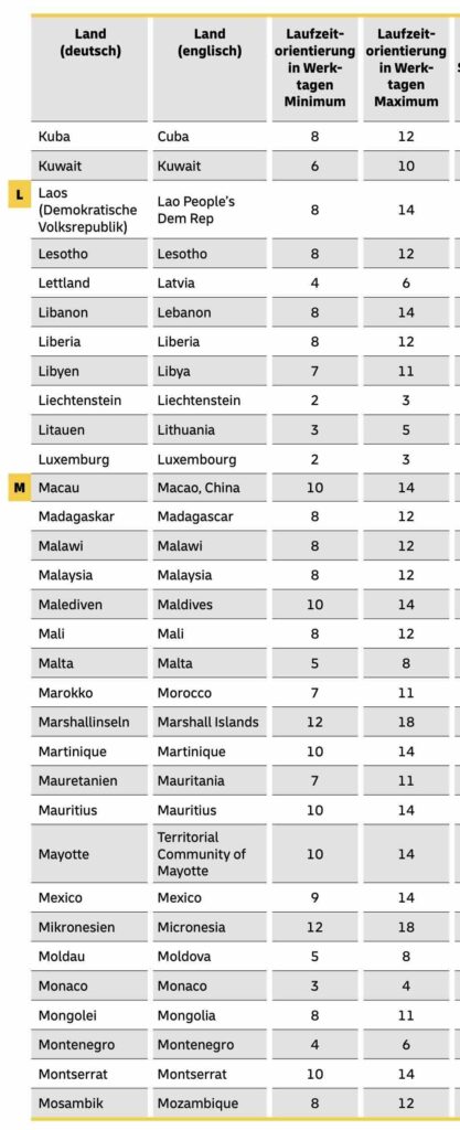 Darüber hinaus gibt das Versandunternehmen DHL folgende Versandzeiten an: